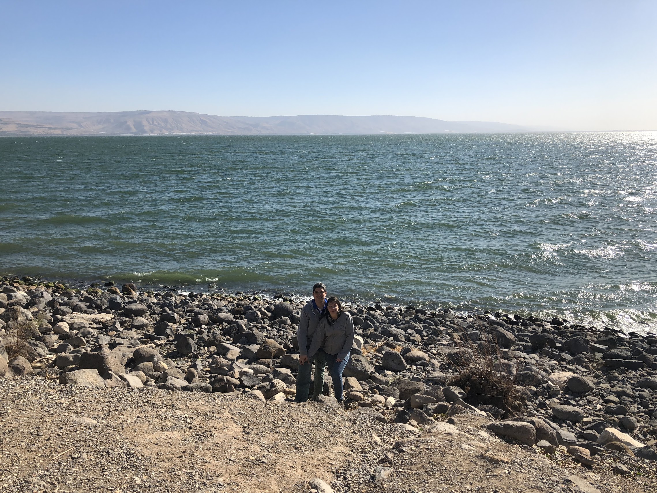 Nos sentamos muy cerca de la orilla del lago Genesaret. Algunos fueron a la playa para tocar el agua. Nan fue a traer un poco de agua en un frasco, y se pegó una su buena empapada. También llevamos piedras del lugar.