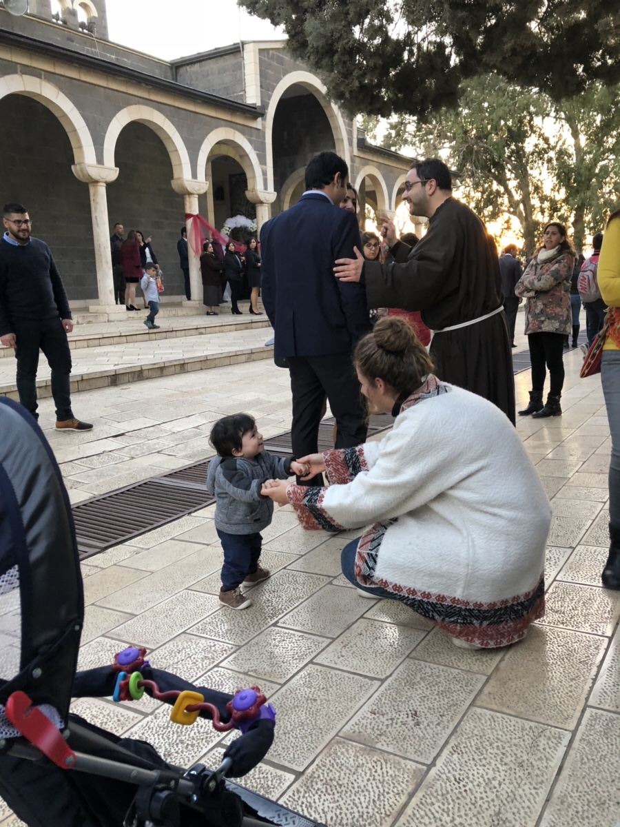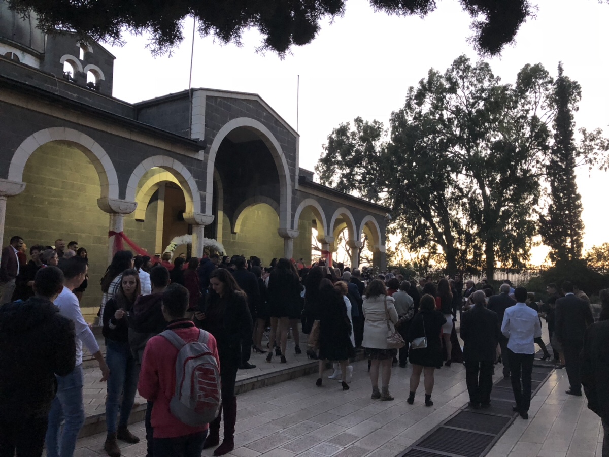 Entramos, y conocimos una capilla muy bonita. Una boda estaba por suceder. Era una boda de palestinos (católicos), así que nos quedamos a ver entrar a la novia. Pero la novia se tardó una su hora en llegar. Es posible que estuvieran esperando que se pusiera el sol para comenzar. Entró la novia y nos fuimos. Era ya de noche. Mientras esperábamos Lorenzo se hizo de varios conectes.